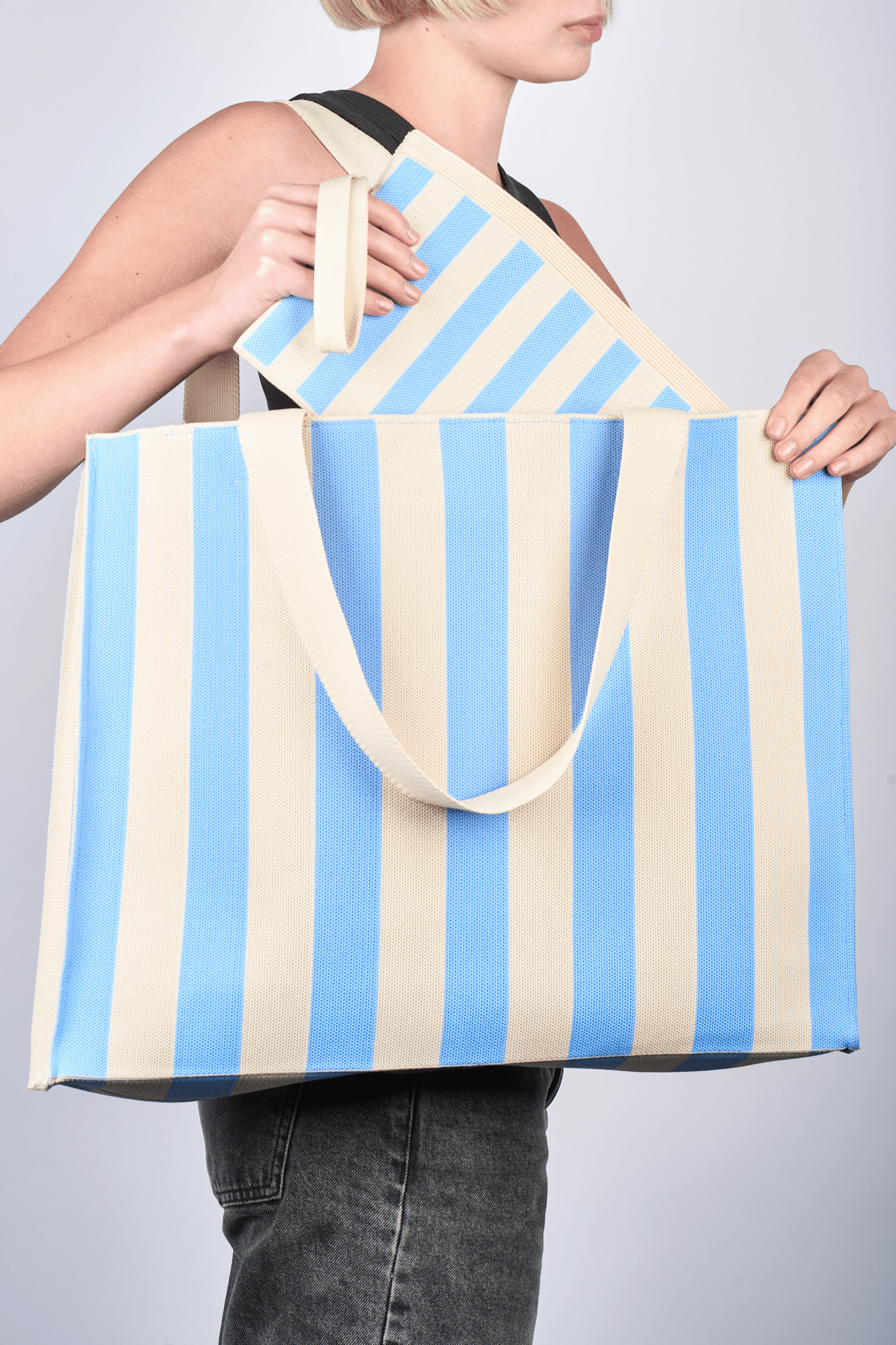 Florence Striped Set Bags in blue and off white combine classic design with practical functionality. This stylish set features two spacious bags with elegant stripes, adding a modern and fresh twist to your wardrobe. Perfect for both everyday use and weekend getaways when you want both style and convenience 🩵☁️