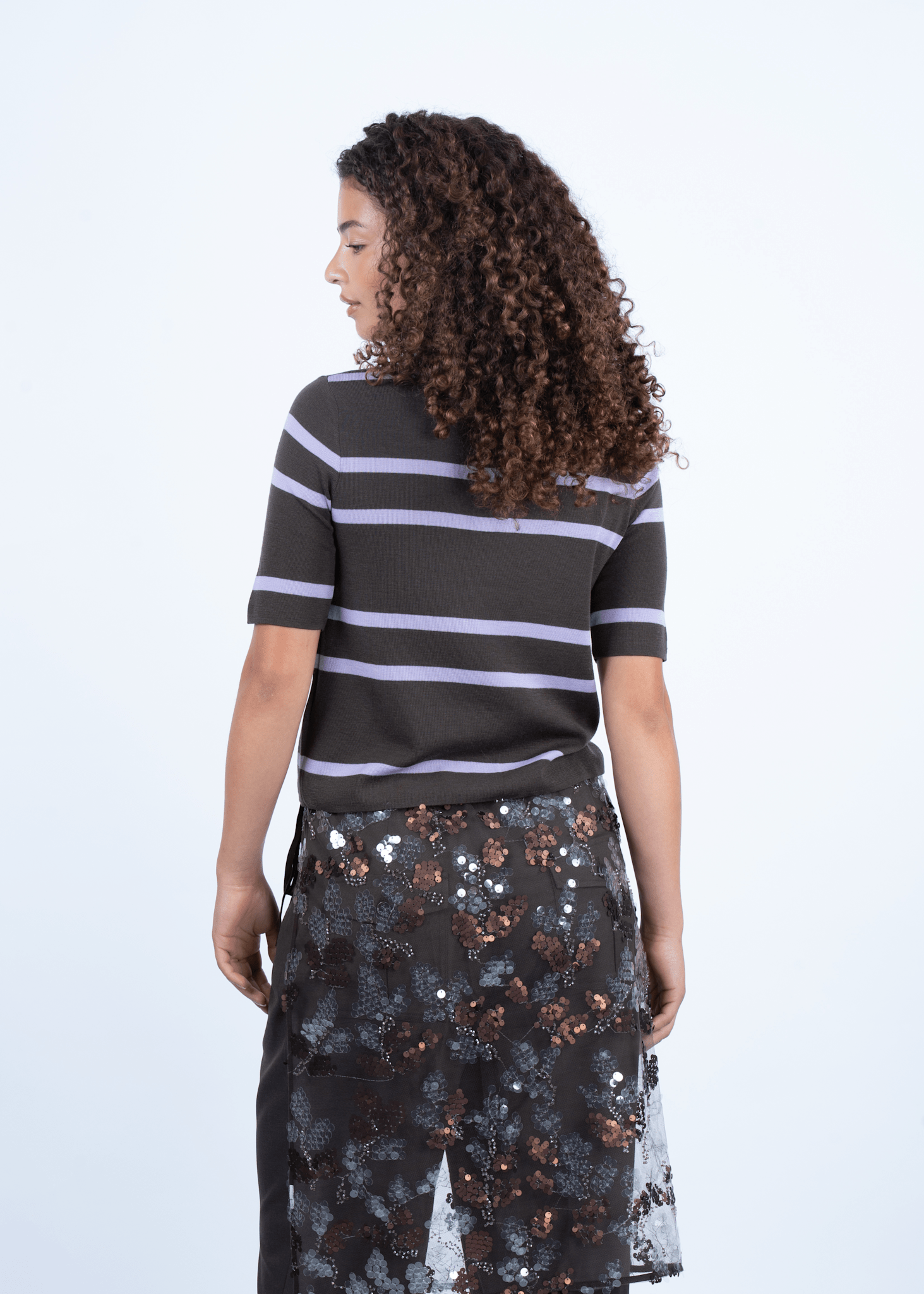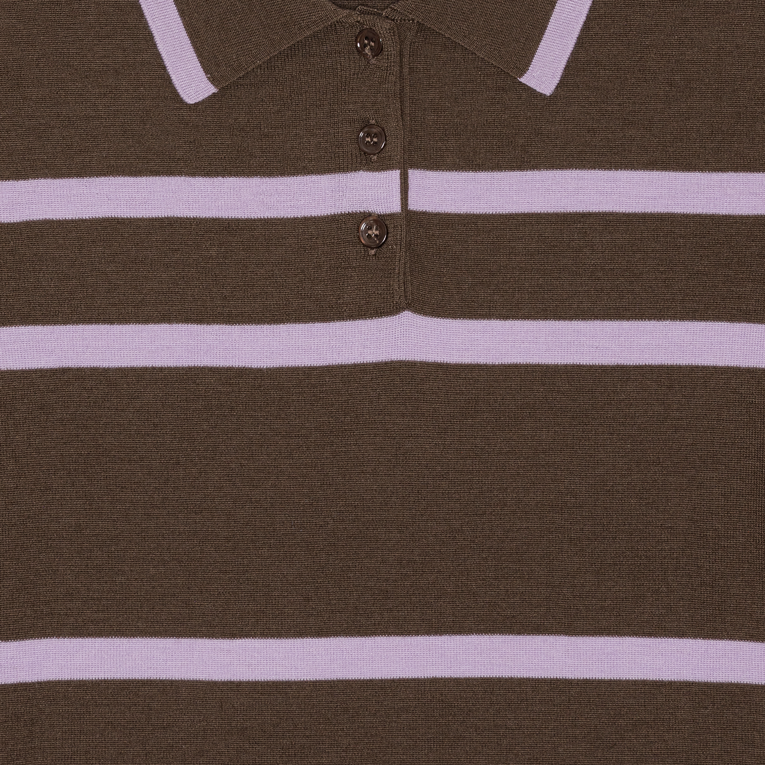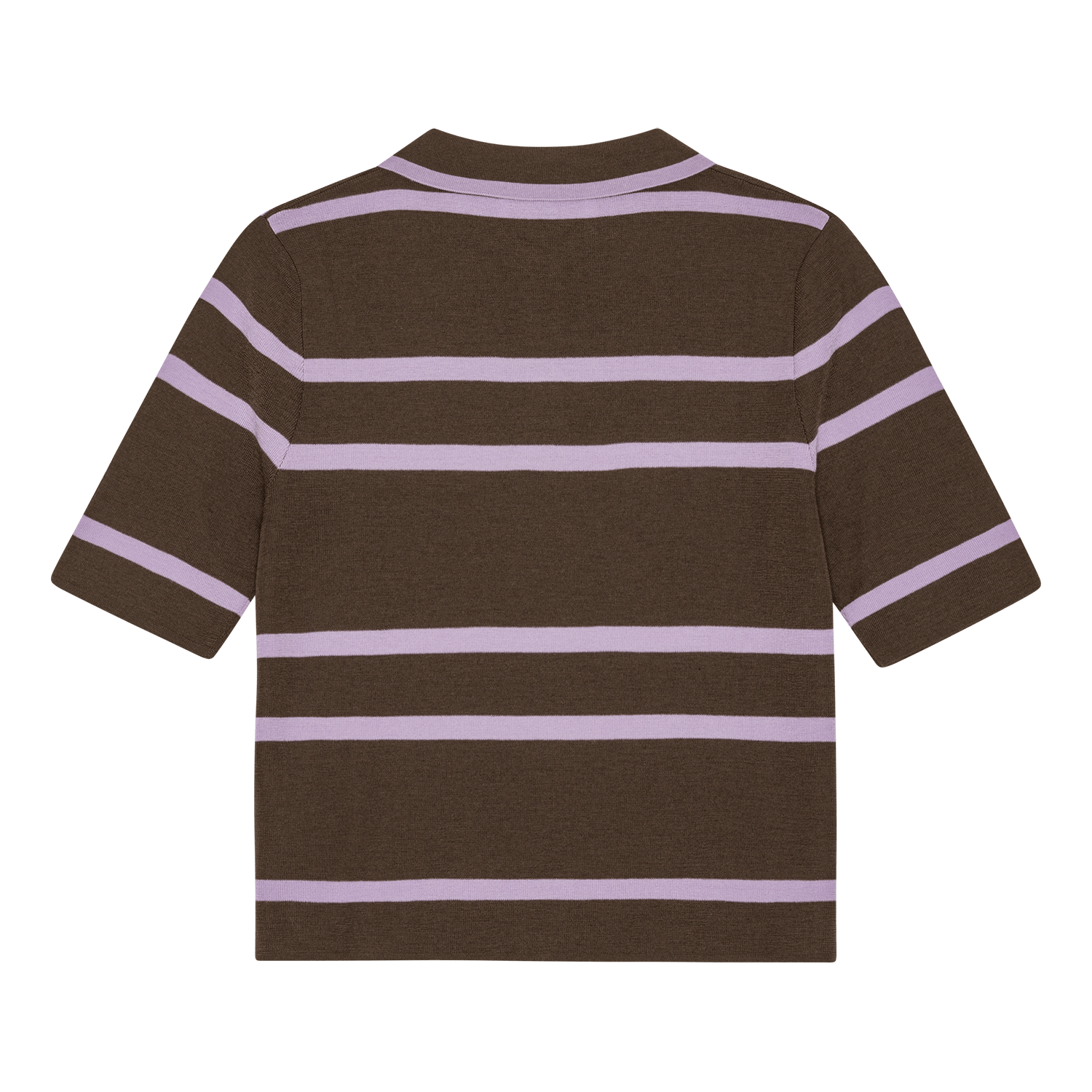 A soft and luxurious knit polo in 100% merino wool - easy to wear, easy to love. The purple stripes add a fresh contrast against the warm brown base, giving the sweater a colorful yet calm expression. With its polo collar and short sleeves, it’s a casual choice that can easily be dressed up or down depending on mood and occasion 💜