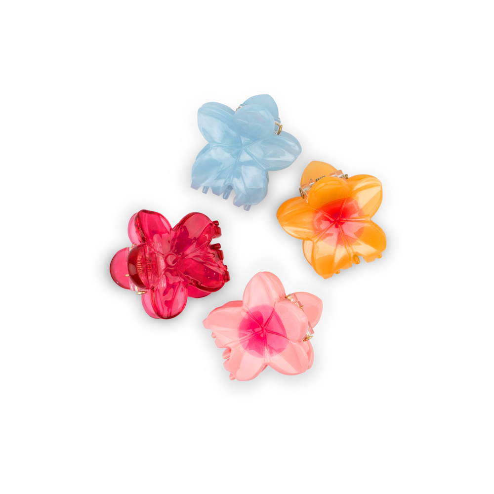 4-Pack Flower Bouquet Mini is a set of four small hair claws shaped like cute flowers, in a beautiful color palette of yellow, light blue, pink, and red.
