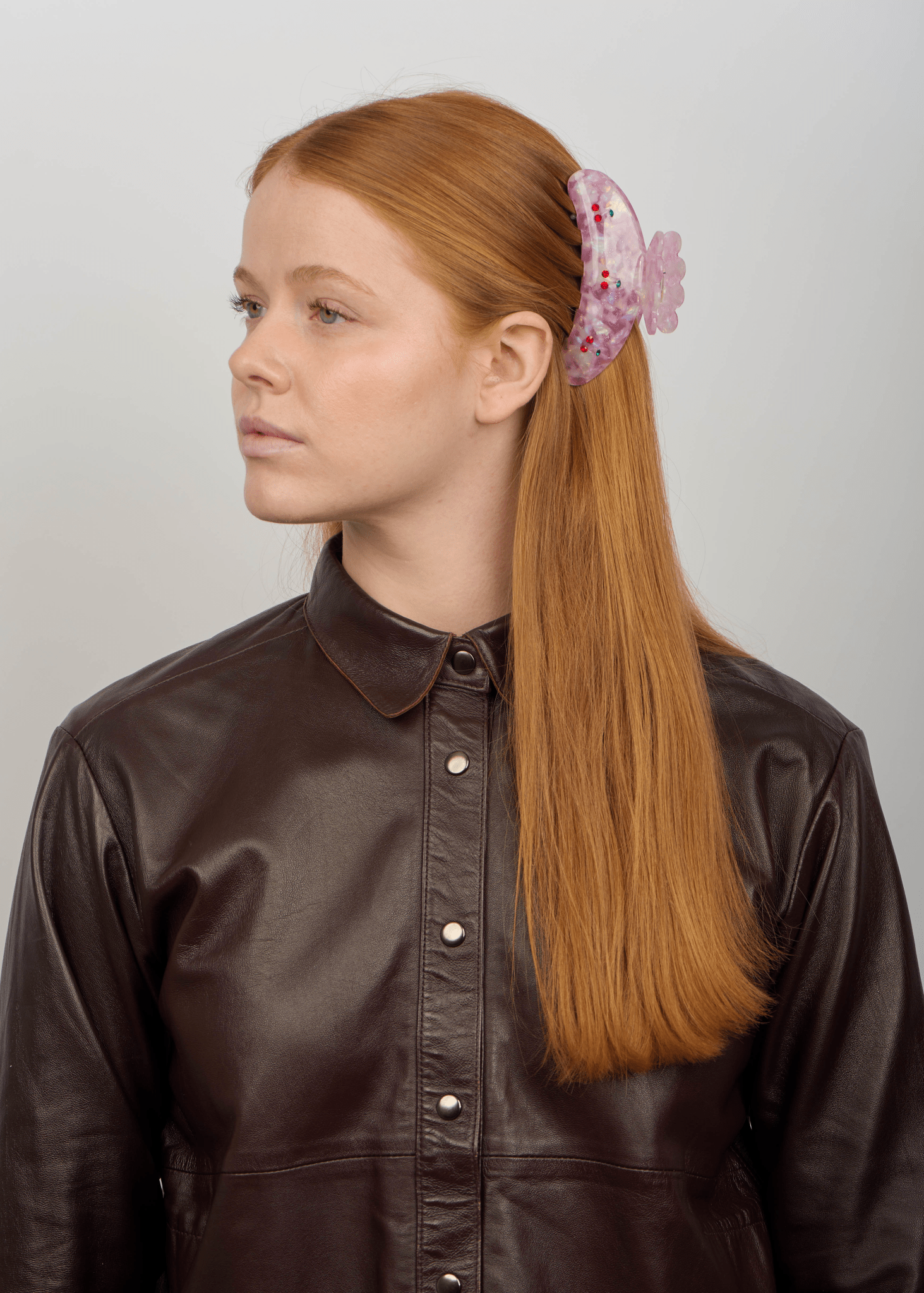Cherry Up Big in pink is the hair accessory that combines playful design with practical functionality. The marbled, sparkling pink base is adorned with small red cherry stones that catch the light and create a sweet and eye-catching expression. It’s the perfect way to add color and personality to your hairstyle 🍒