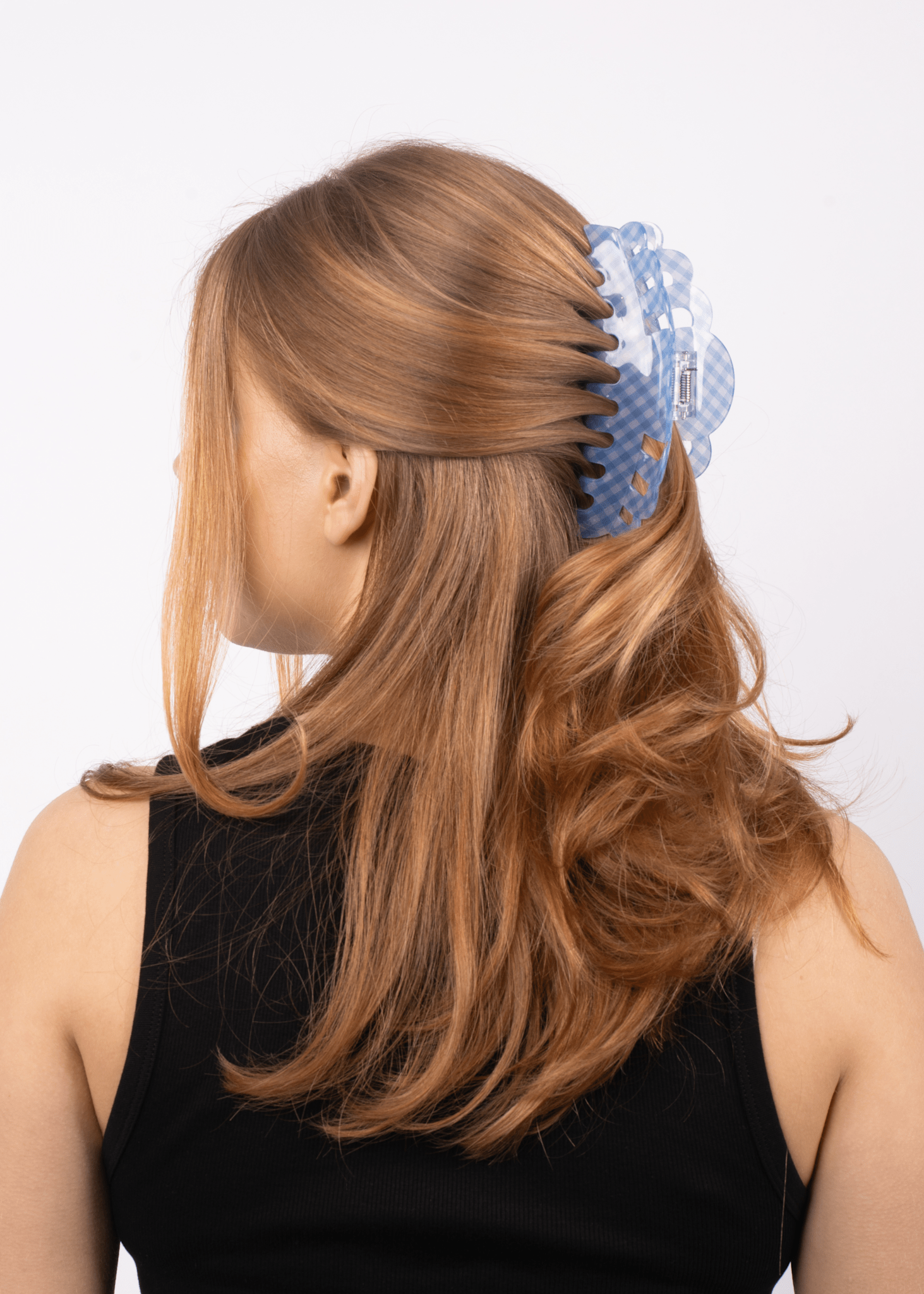 Emma Checkered Giga is made for those who love a blend of playful patterns and practical functionality. The beautiful light blue checkered design adds a fresh touch to your hairstyle, while the extra-large size provides a strong grip, perfect for thick or long hair 🩵