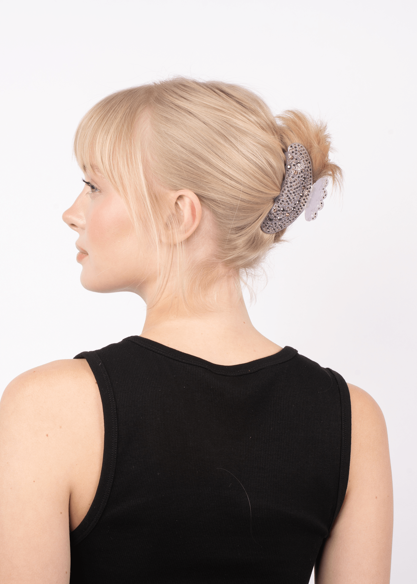 Helen Secret Middle in light lavender is for those who love a little extra sparkle in everyday life. Decorated with small crystals in purple and silver that catch the light, it adds an elegant twist to your hairstyle. Use it to gather your hair at the nape, create a half-up style, or as a decorative detail in an updo. The curved shape provides a secure grip and makes it easy to use - suitable for all hair types 💜