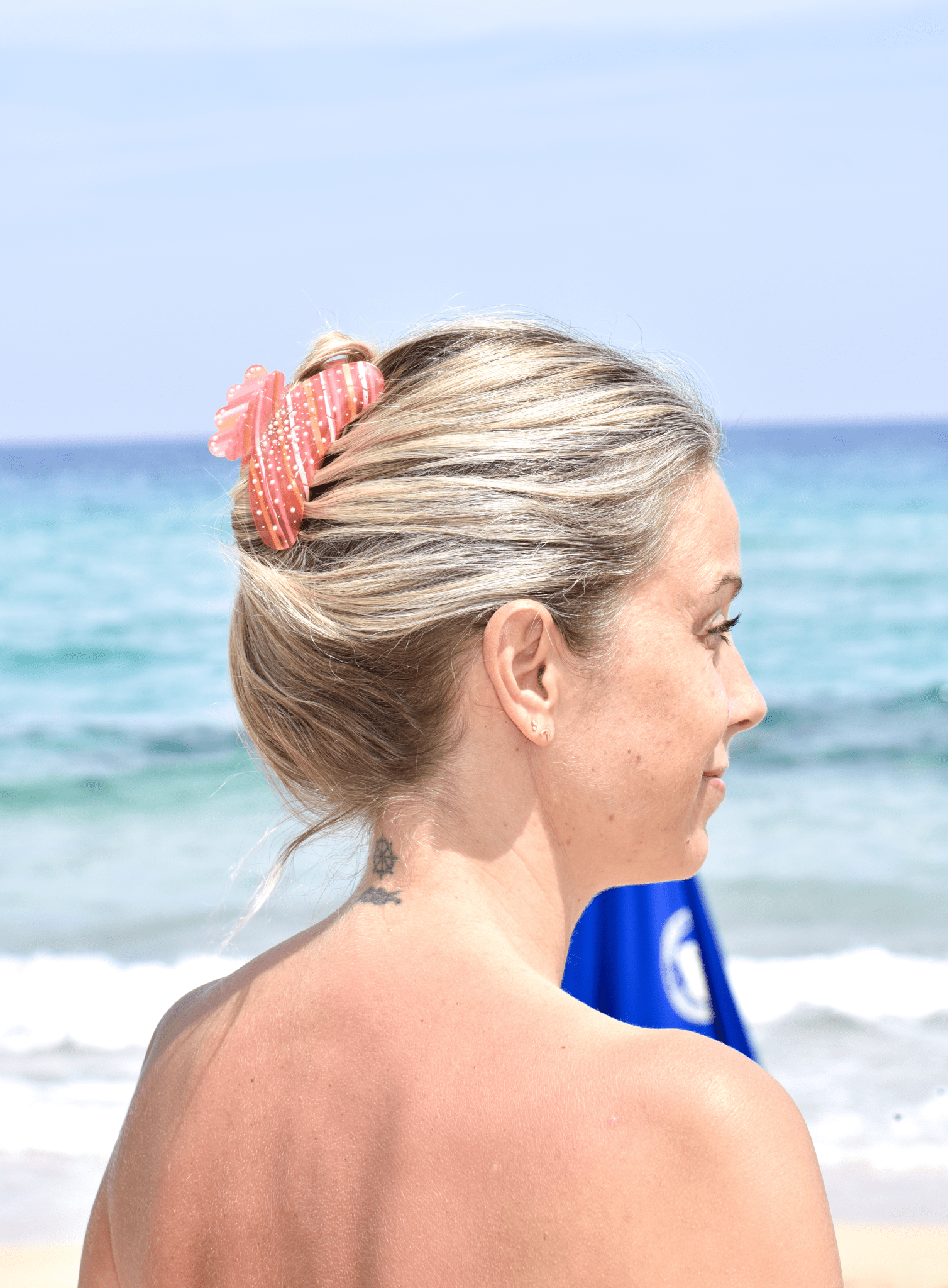 With radiant shades of pink and red and tiny pearls scattered like water droplets, this hair claw feels like a summer day by the sea. Designed for those who love color and the magic of detail 🩷