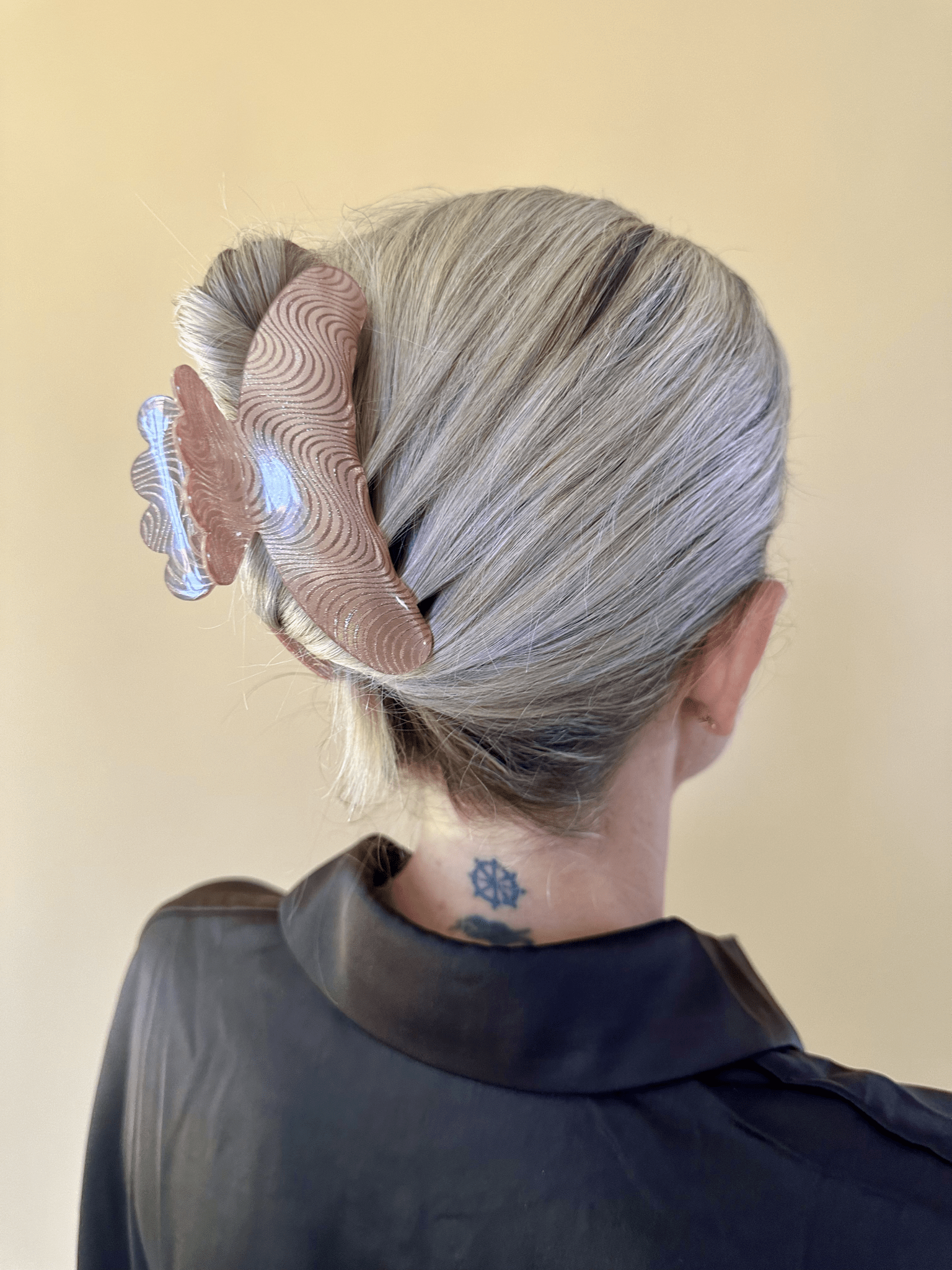 Helle Sprightly Big in pink is the hair claw that radiates sparkle and good vibes. With its soft wave pattern and shimmering finish, it feels both light and luxurious - like a touch of rosé sunshine in your hair. The large size provides a strong grip, making it easy to style everything from loose updos to messy twists. A playful statement piece that shines both at the office and at the café 🌸