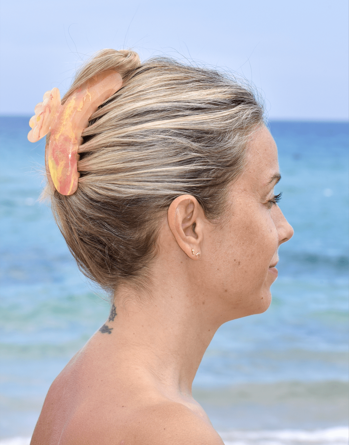 Bring the warm colors of sunrise into your styling with Helle Sunrise Biggest! This oversized hair claw features a unique marbled pattern in radiant orange and peachy tones, giving your look a fresh and vibrant expression 🍑