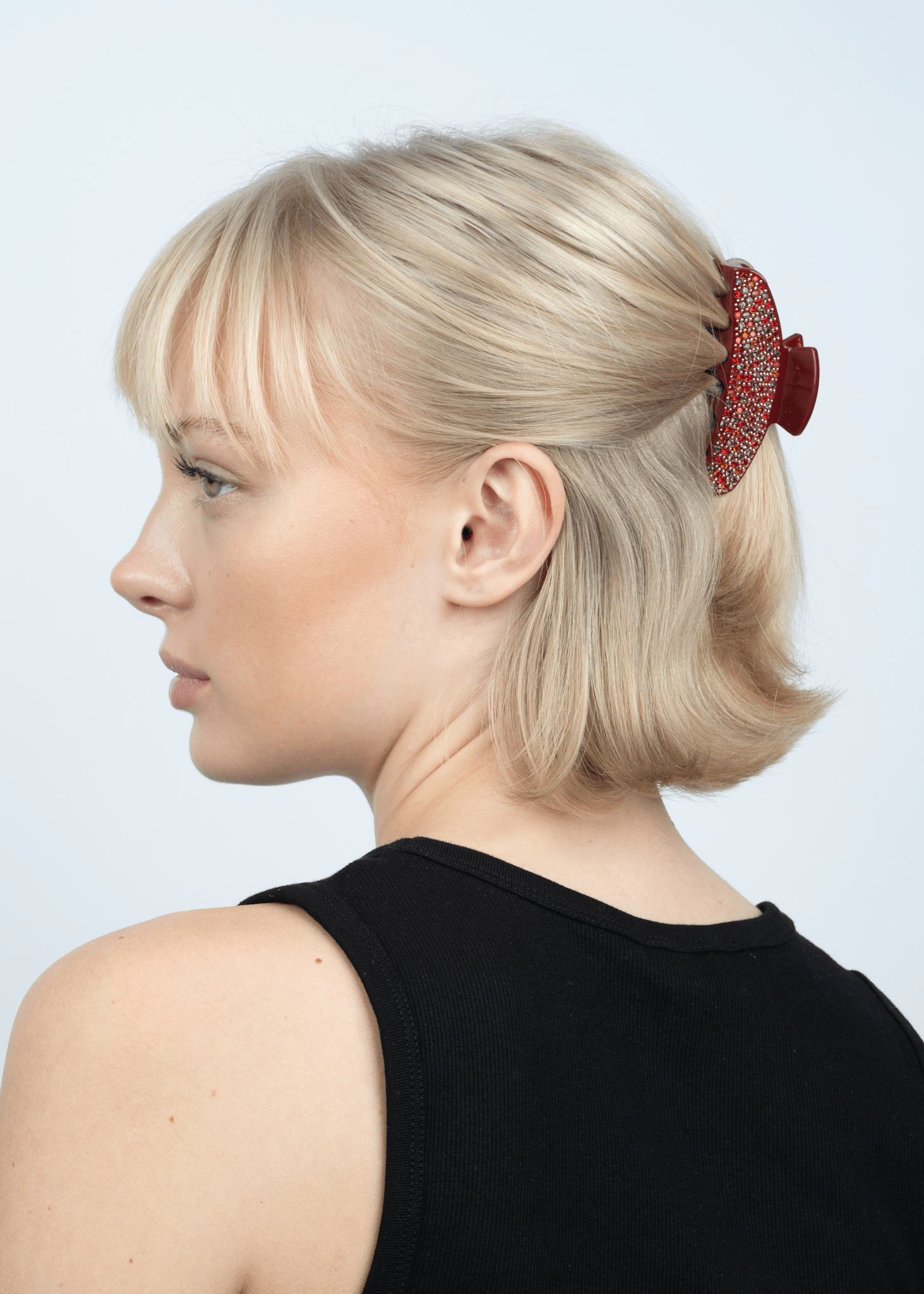 The deep red shade combined with sparkling rhinestones creates an elegant and dazzling expression. Its medium size makes it ideal for securing larger sections of hair or creating a beautiful updo - all while sitting comfortably and securely all day long 🌹
