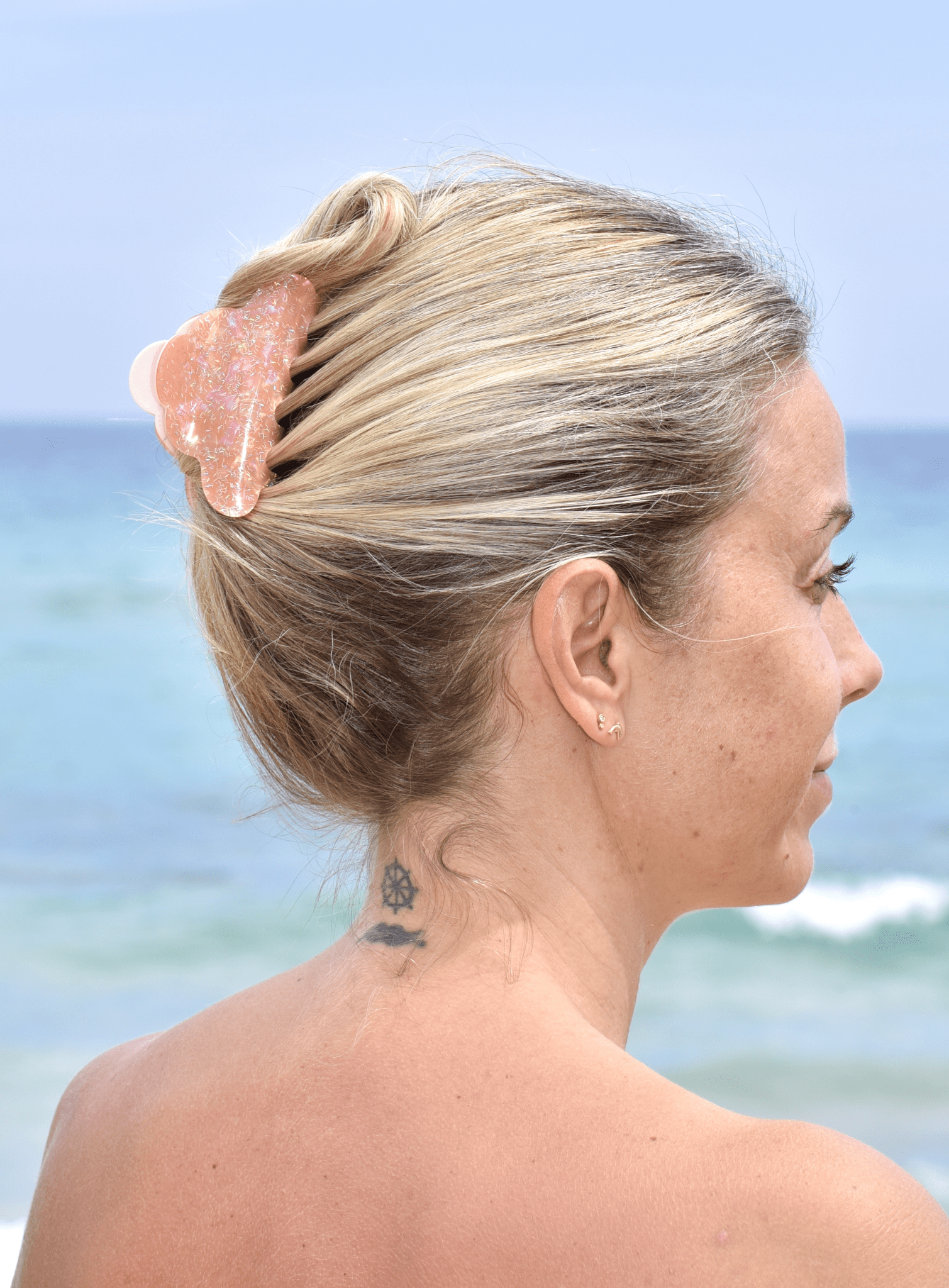 Lene Summer Nights Big is a playful and feminine hair claw that radiates the warmth of summer evenings and festive vibes. Its shimmering peach color with subtle pearlescent details catches the light beautifully, adding a touch of glamour to your look 🌸