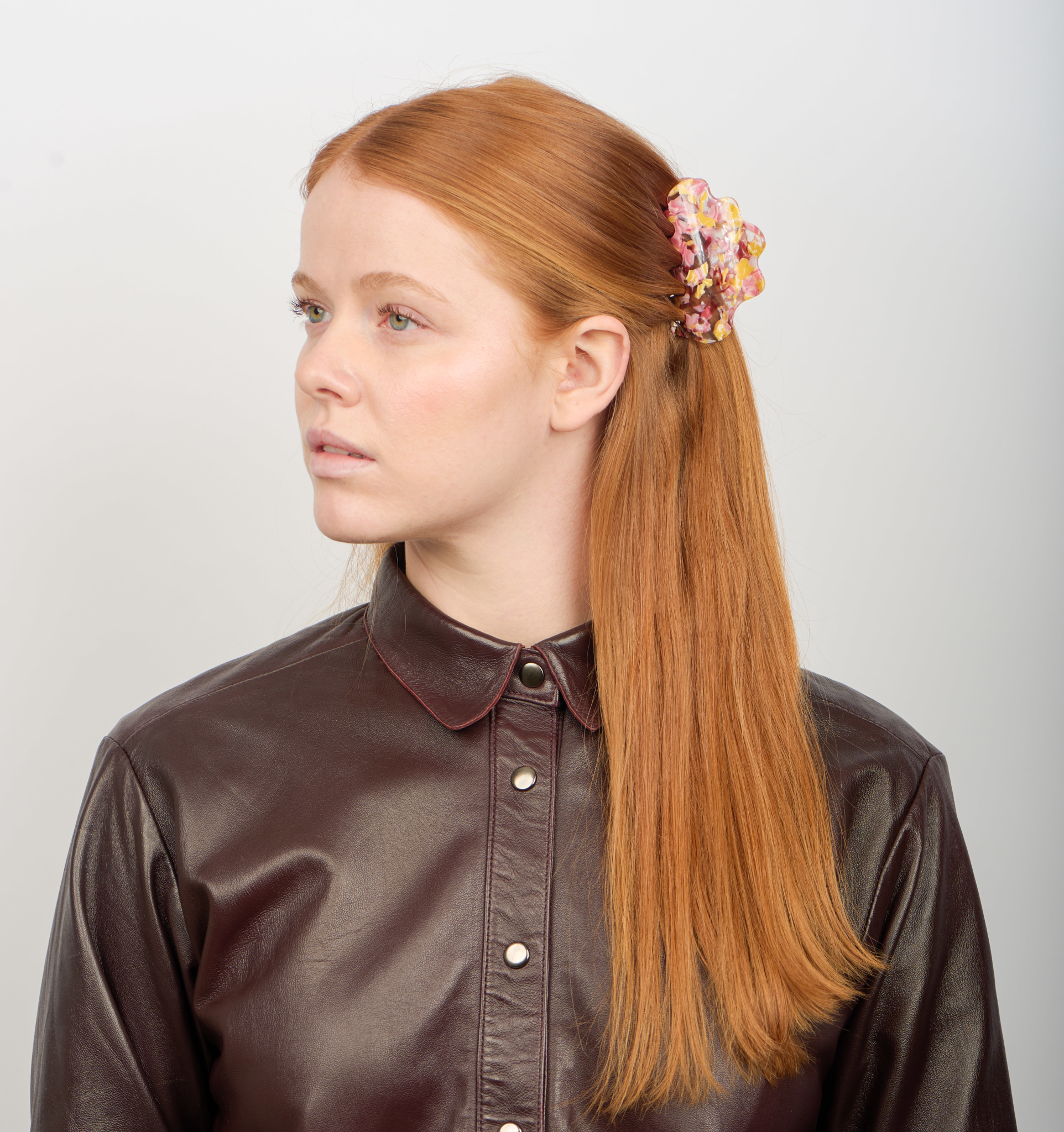 Pernille Wavy Big is the hair claw that instantly catches the eye. The unique color mix of pink, yellow, burgundy, and amber creates an intense and playful effect that brings color and personality to any hairstyle 🌸