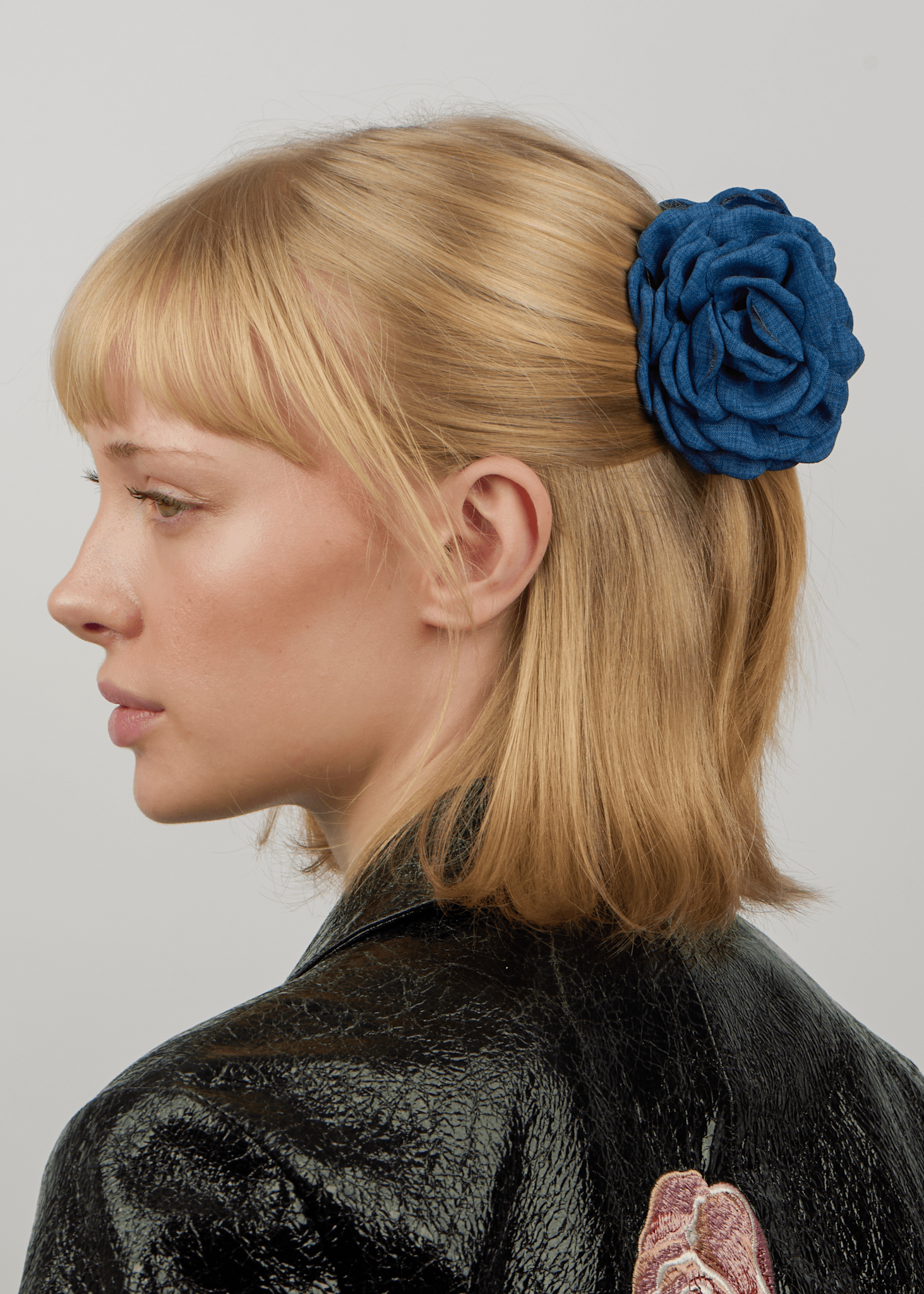 Rosa Hair Claw in denim is a beautiful and eye-catching hair clip shaped like a large flower. The unique denim look adds a cool, modern twist to the feminine design. Its solid construction ensures a strong grip, making it ideal for both thick and fine hair 💙