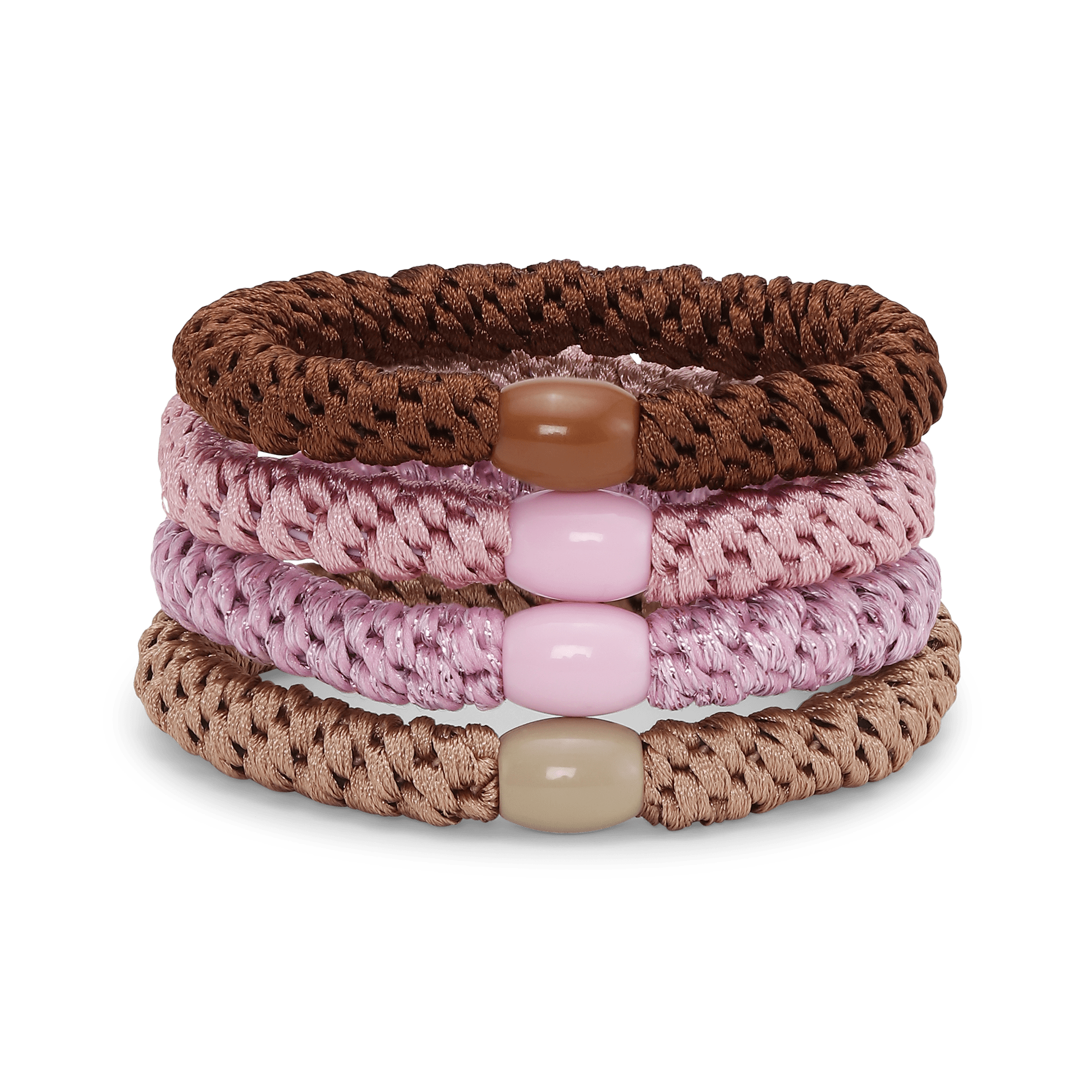4-Pack Basic Essentials Elastics is a set of four functional and stylish hair ties in warm, natural tones: dark brown, light brown, rose, and beige.