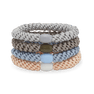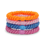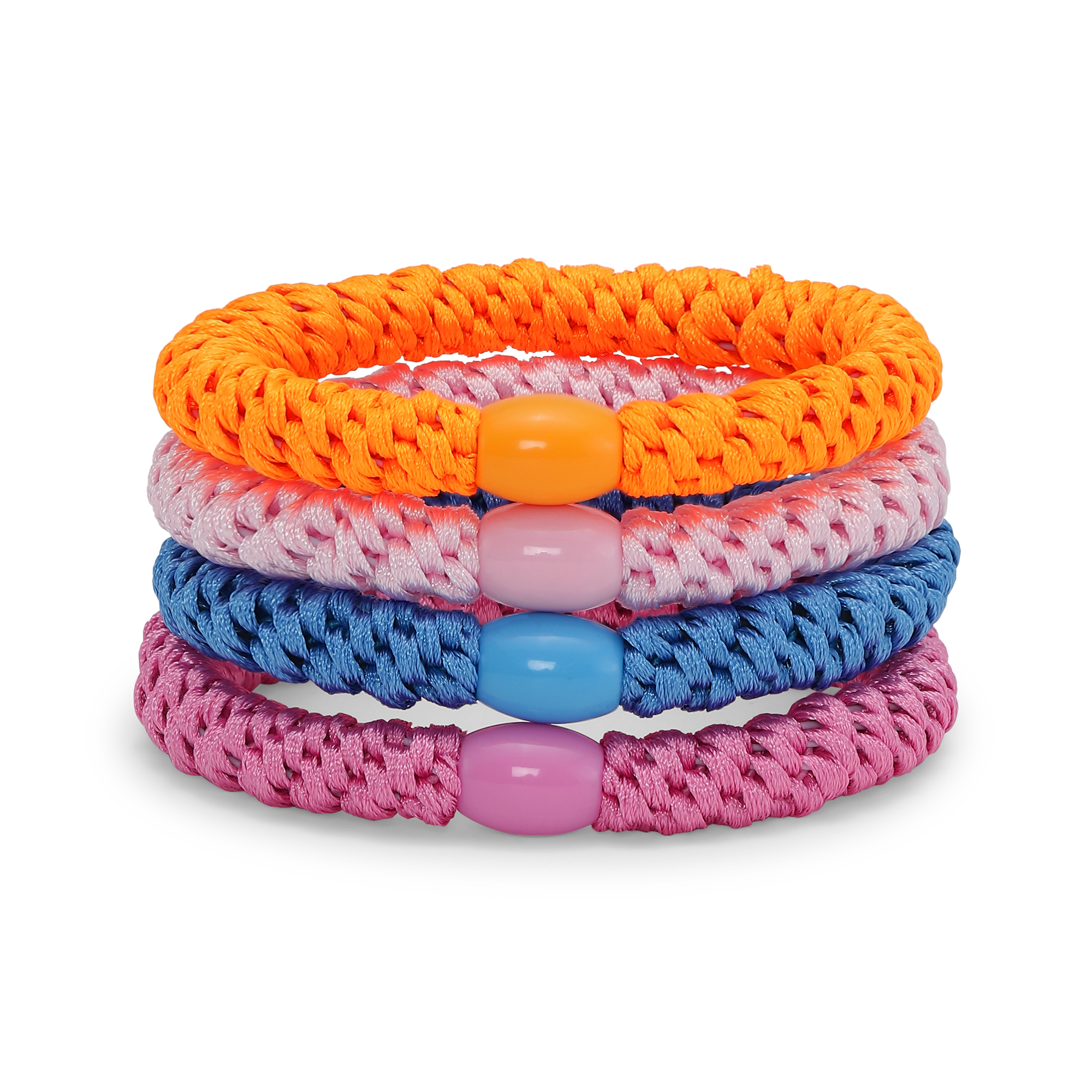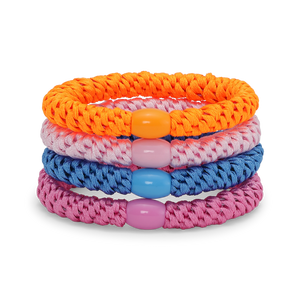 4-Pack Basic Essentials Elastics is a set of four functional and stylish hair ties in fresh and vibrant colors: blue, orange, pink, and light pink.
