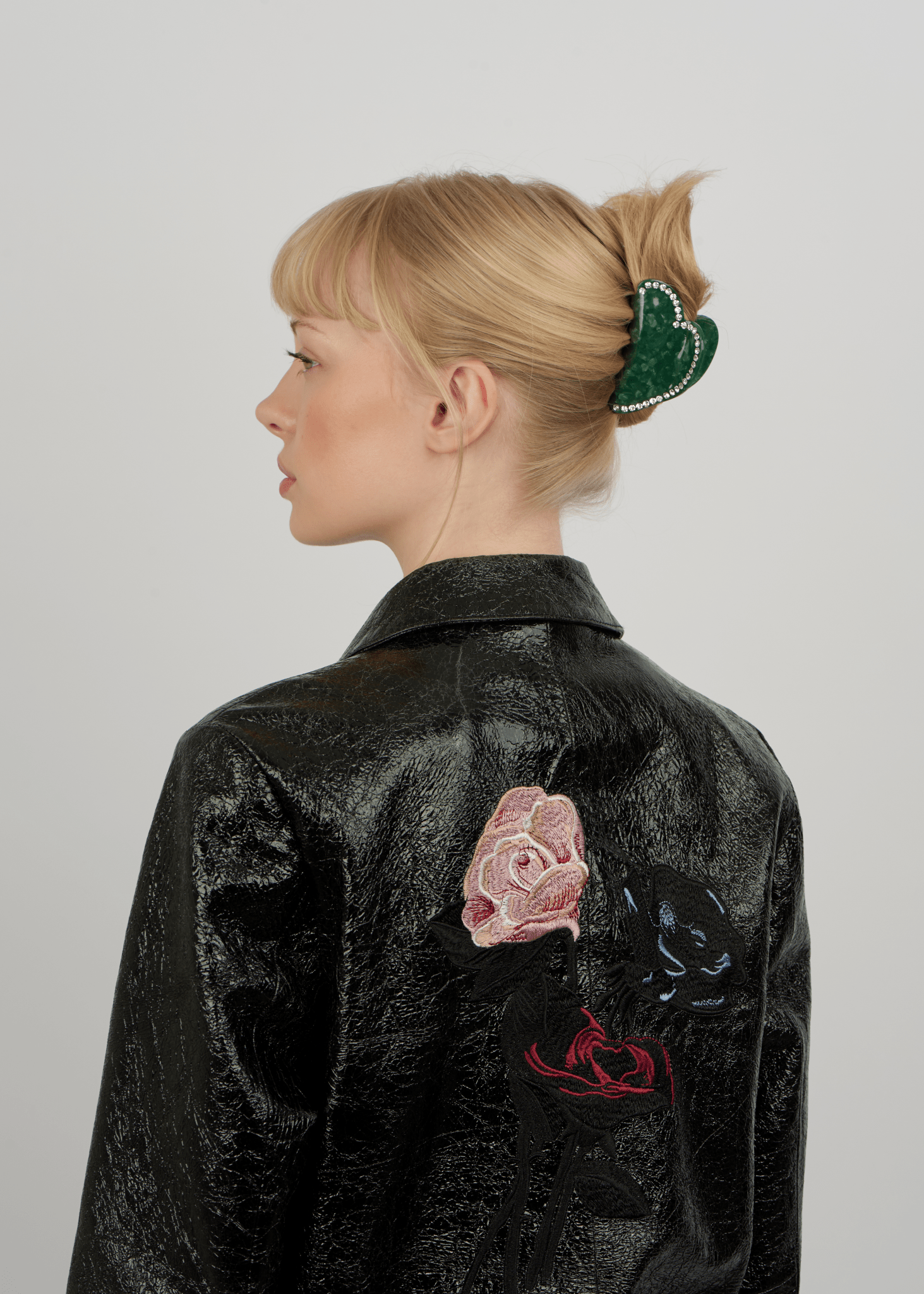 With its deep green marbled base and clear heart-shaped crystals, you get an accessory that feels both sophisticated and playful 🌿