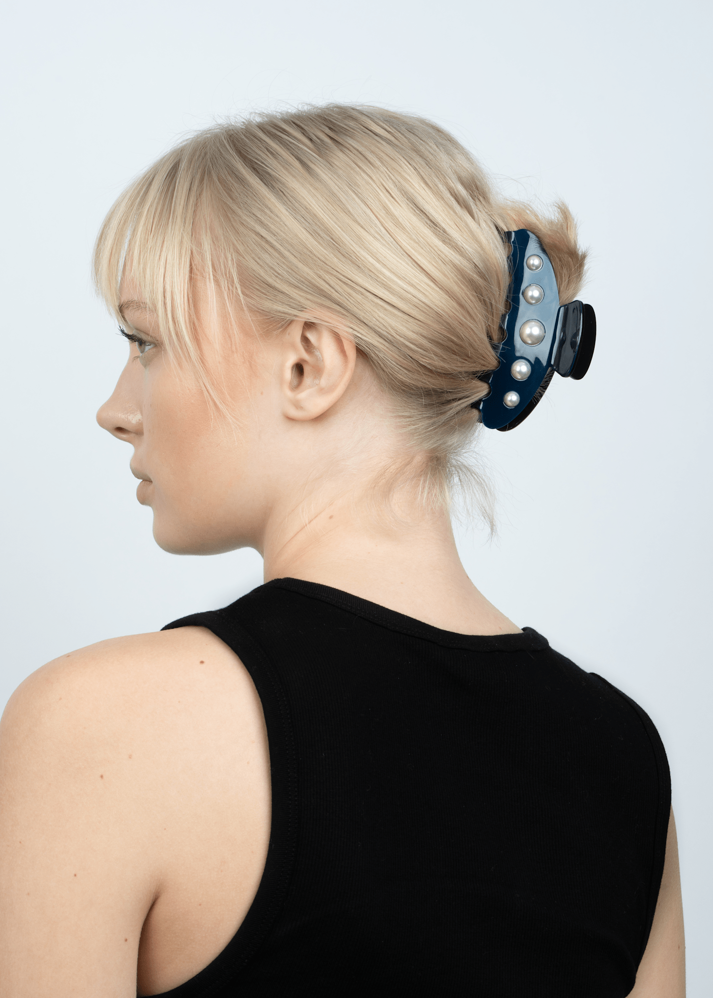 Add an elegant touch to your hairstyle with the Ida Classic Pearly Big in Midnight Blue. This large hair claw features a classic design in a deep midnight blue shade, adorned with beautiful pearls that bring a feminine and exclusive detail. Perfect for long or thick hair, offering a strong and secure grip 💙