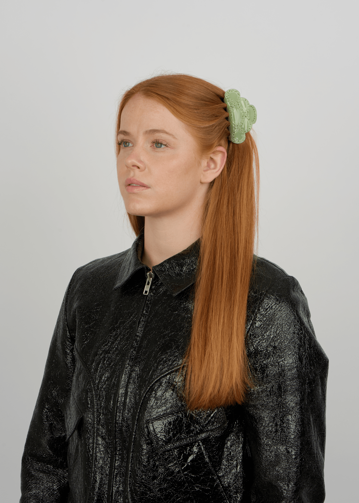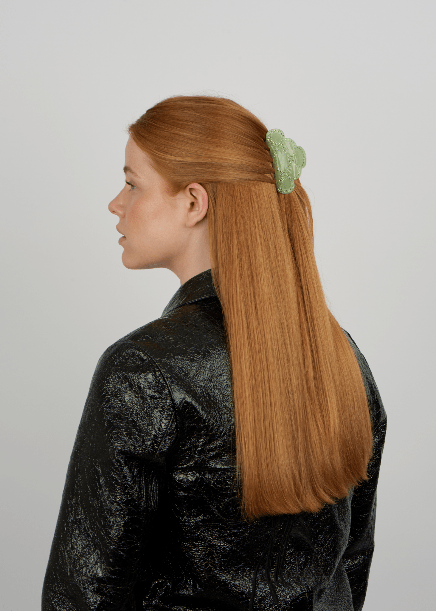 Liv Circular Middle is a beautiful hair claw in a fresh mint green color, decorated with small green stones in a soft and playful wave pattern. It’s perfect when you want to gather your hair in a simple yet eye-catching way 🌿