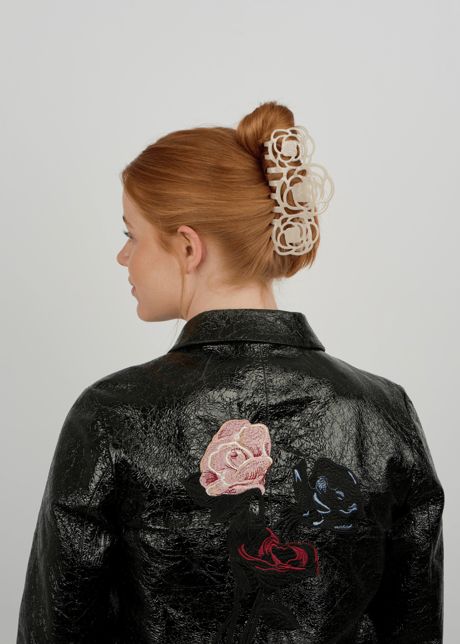 Rosie Giga in Cream is a spacious and elegant hair claw featuring a slightly translucent design and delicate rose motifs on each side. The soft cream color adds a classic and sophisticated touch, while the extra-large size ensures a strong grip, perfect for long or thick hair 🌹