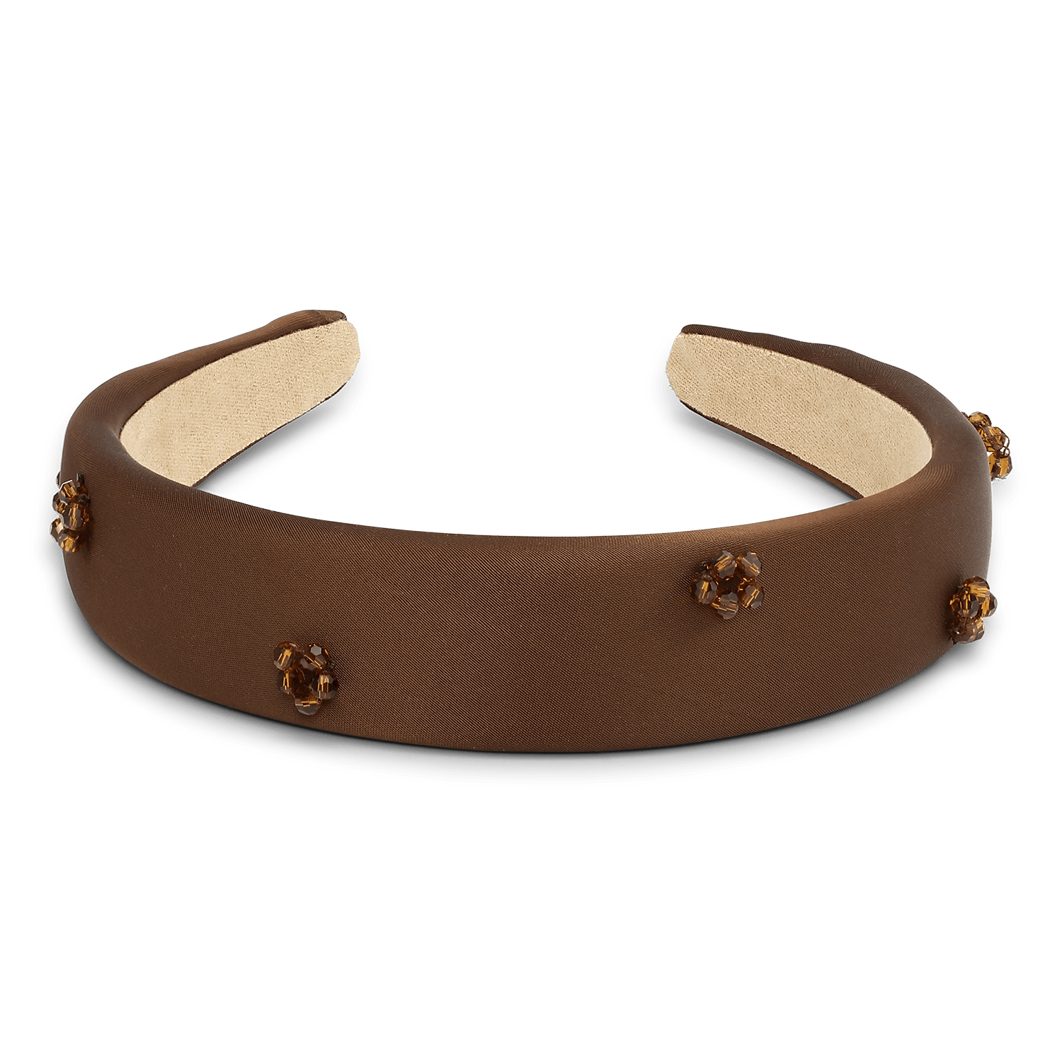 Floral Gleam Headband is a beautiful headband in a warm brown shade, adorned with delicate floral pearl details in golden amber tones. The design balances classic elegance with decorative charm, easily adding a feminine touch to your outfit 🤎