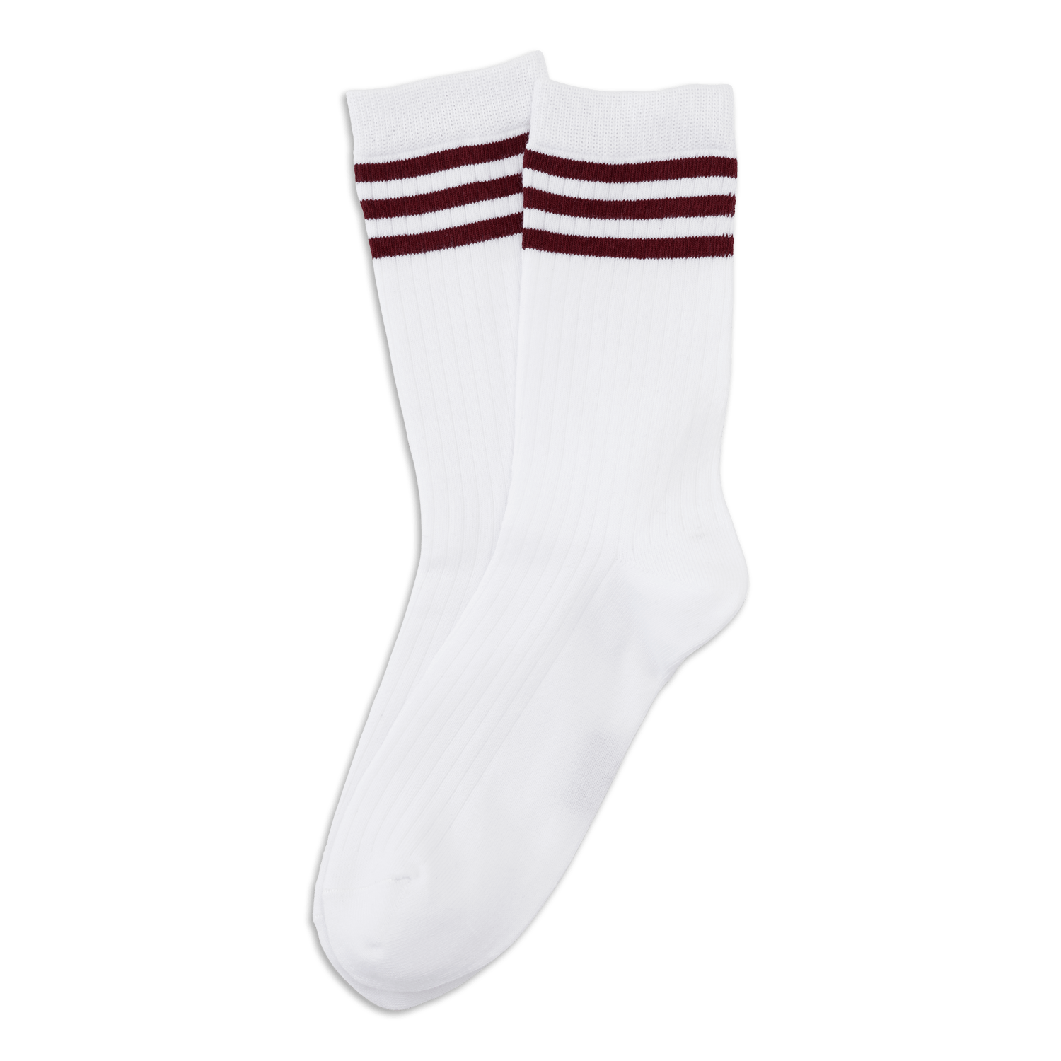 Retro Sport Stripe Socks in white with burgundy stripes combine classic sporty style with cozy comfort. The ribbed texture ensures a secure fit all day, while the deep-colored ankle detail adds a simple and stylish touch. Perfect for both everyday wear and relaxed days when you want something that feels great and looks good 🍇