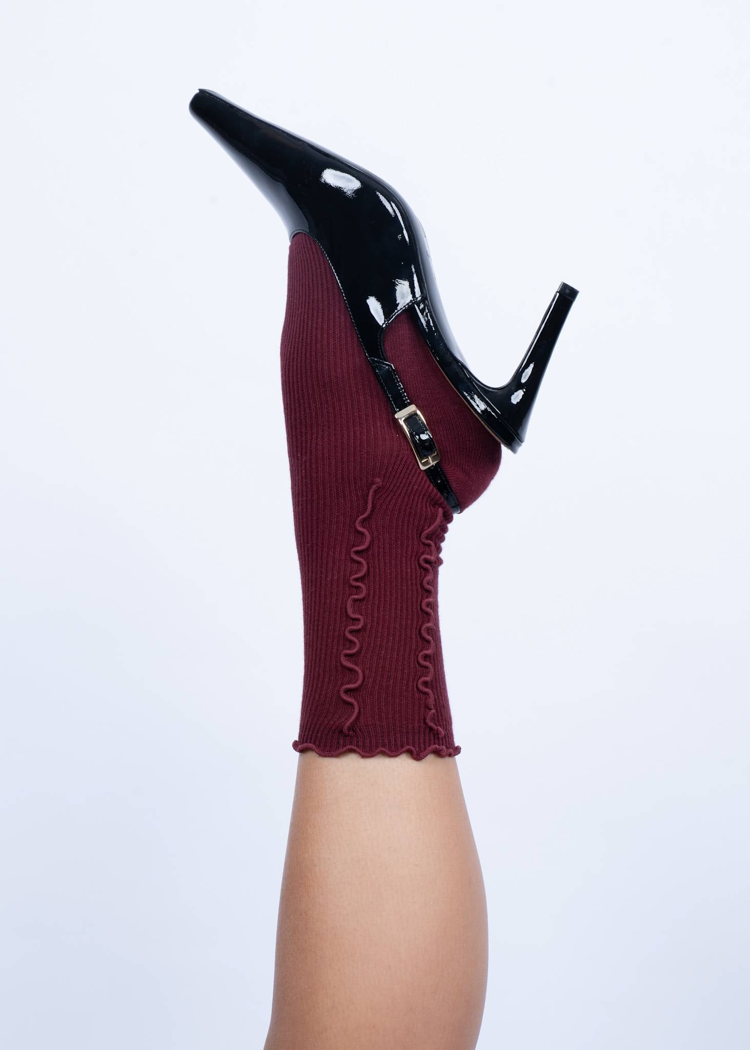 Ruffle Socks in burgundy are both soft and chic - perfect for adding a little extra to your everyday look. The ruffled edges and ribbed texture give a feminine and playful touch, while the color goes well with most pieces in your wardrobe 🍇