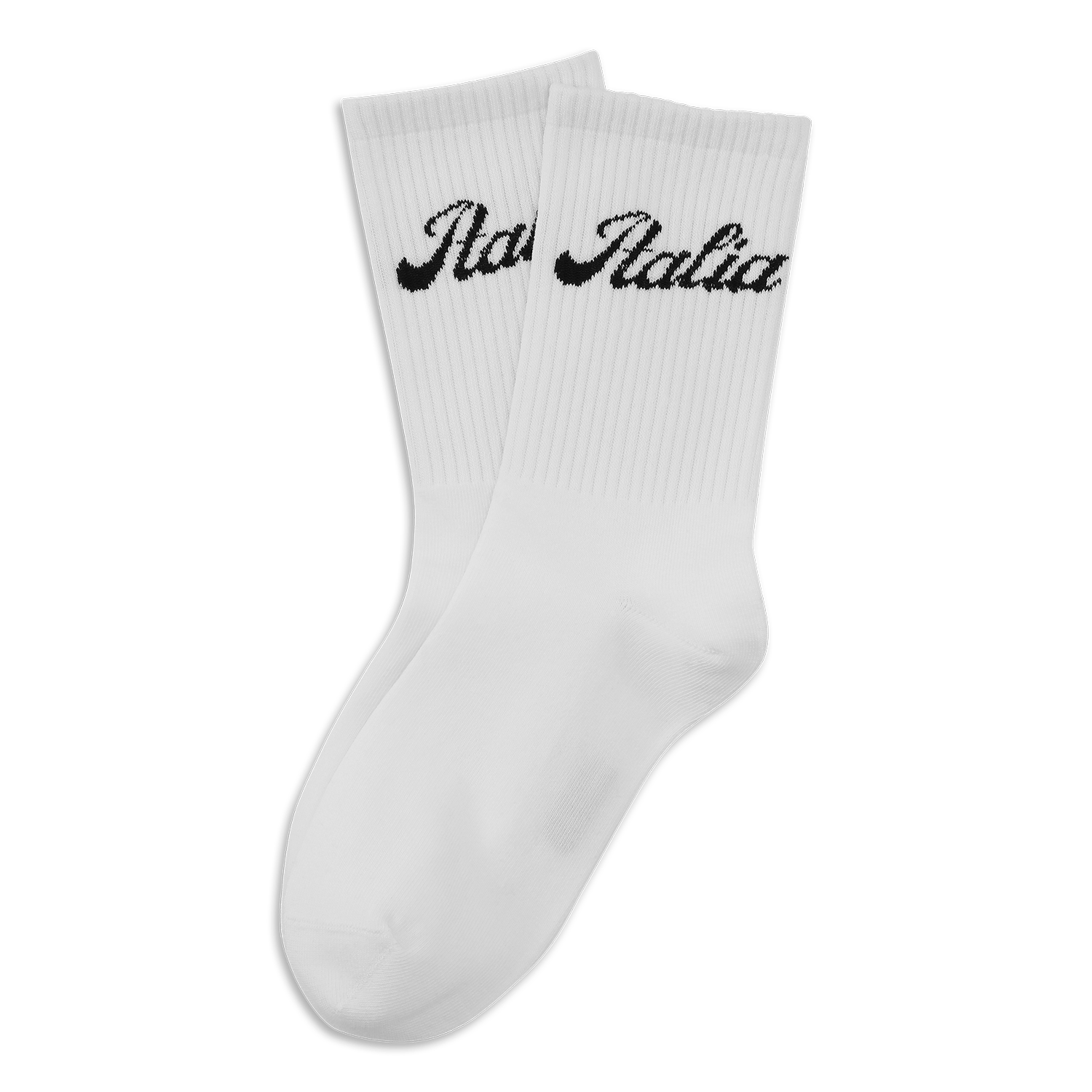 Hvide sokker med ribstrikket kant og "Italia" broderet i sort.