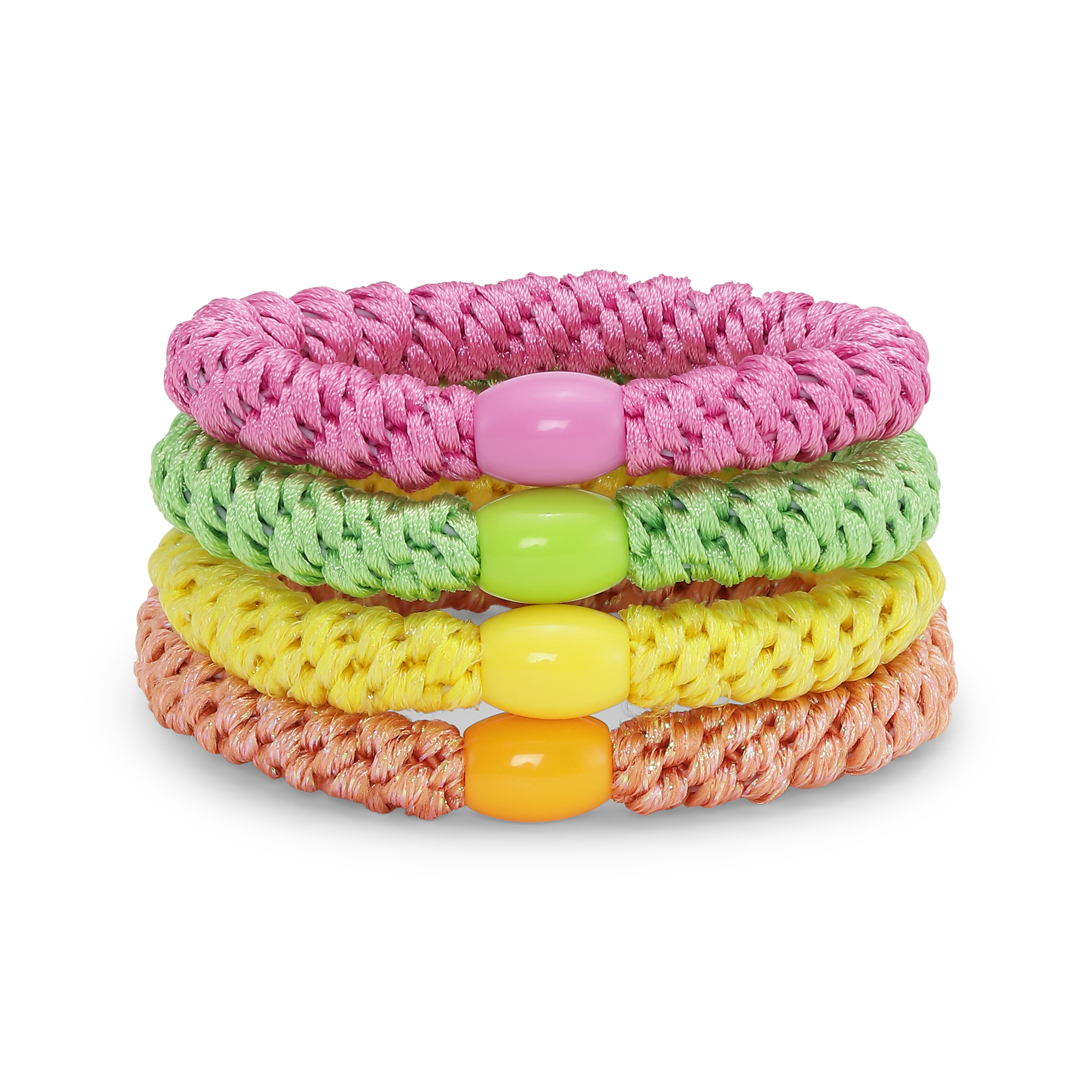 4-Pack Basic Essentials Elastics in Charter is a set of four stylish and functional hair elastics in a colorful combination of pink, orange, yellow, and green.