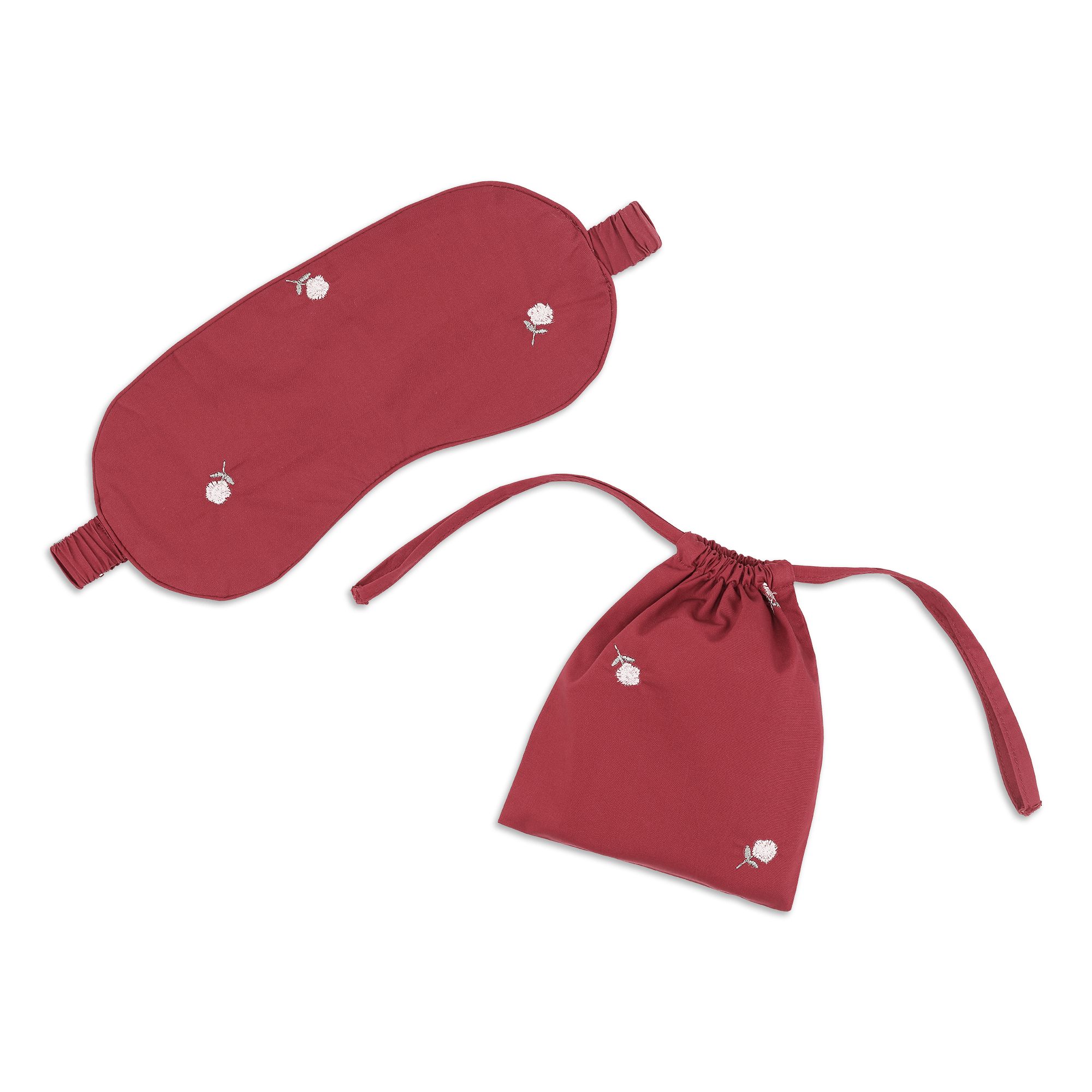 Bobbie Sleep Mask i burgundy bomuld med hvide blomsterbroderier og tilhørende opbevaringspose.