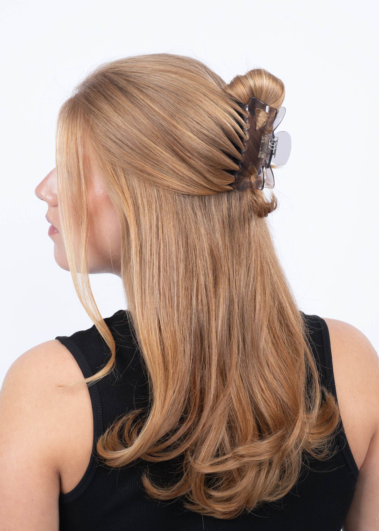 Sæt den i en løs knold, low ponytail eller som pynt i siden. Den er smuk alene – og endnu bedre med et rødt læbelook.