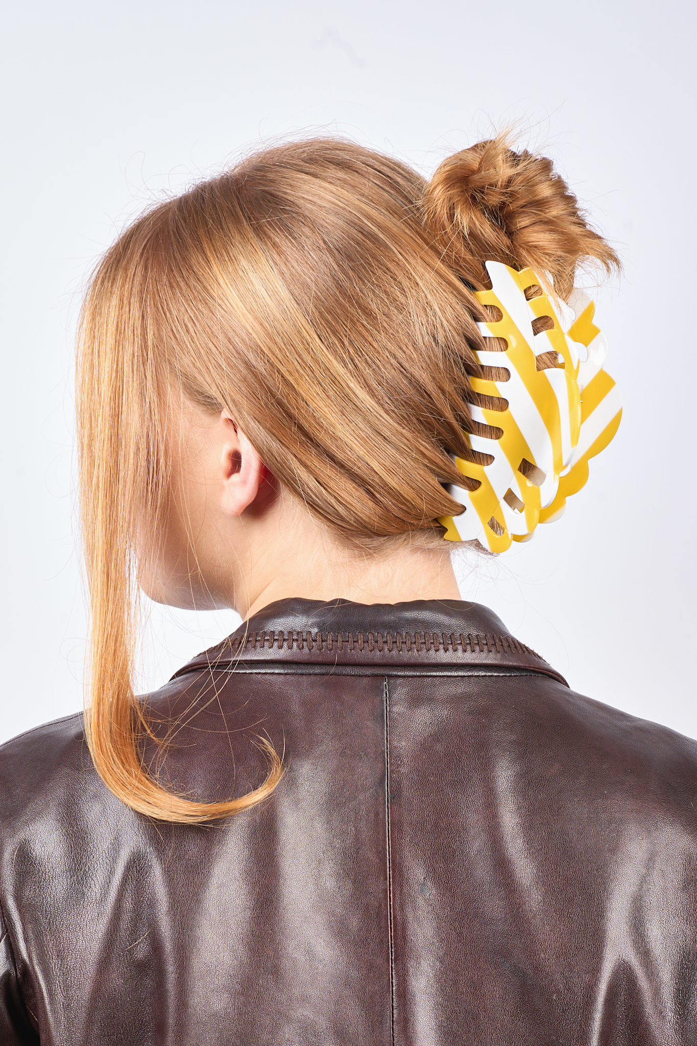 Give your look a colorful and powerful lift with Emma Striped Giga in a radiant yellow shade. This extra-large hair claw is designed with elegant stripes that blend a modern, stylish look with maximum functionality. Perfect for thick or long hair, offering a strong grip while adding a fresh and eye-catching touch to your hairstyle 💛