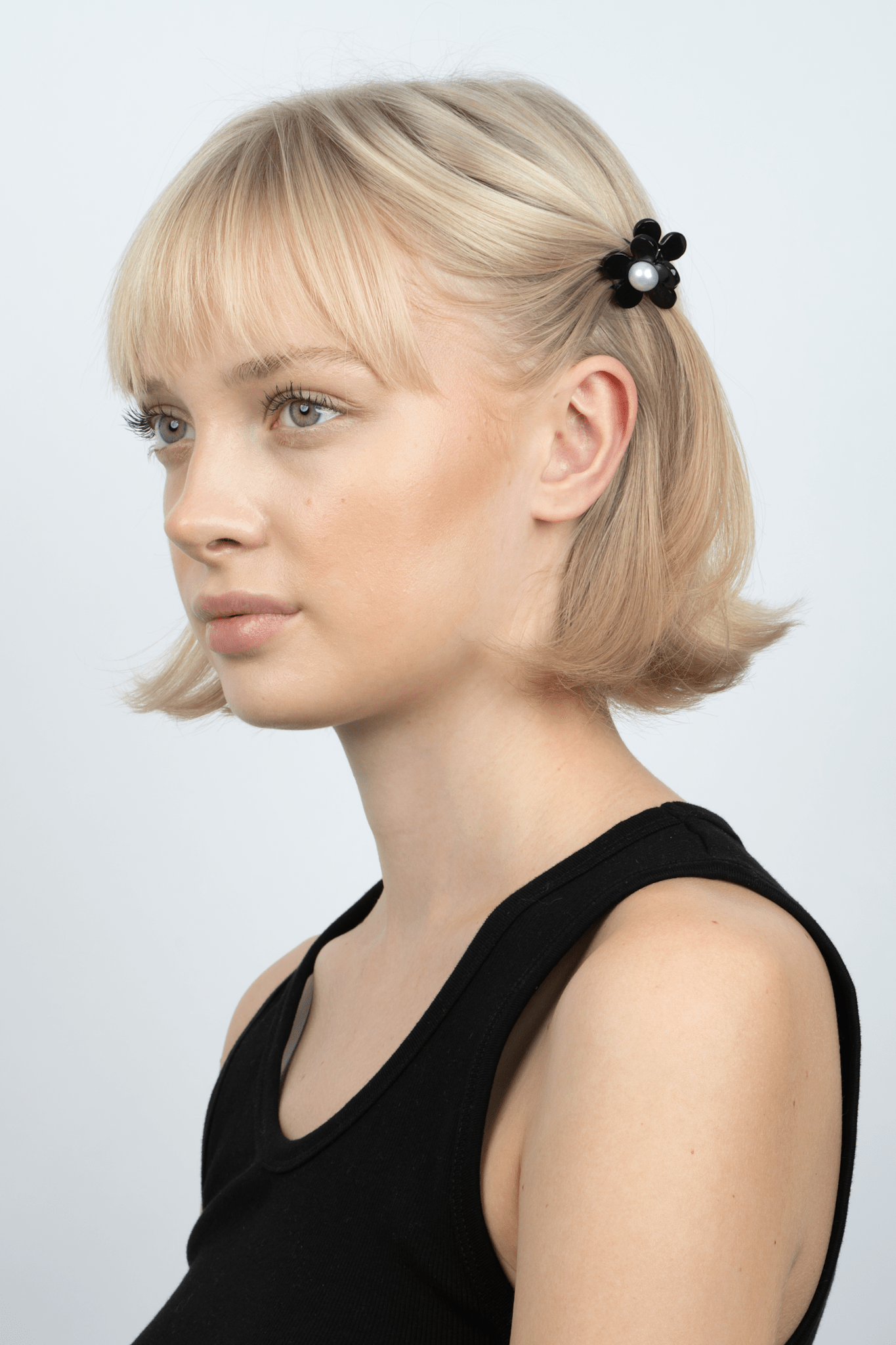 This delicate hair claw is shaped like a flower and features a small pearl at its center, adding a beautiful and decorative detail. The black colour makes it easy to style and perfect for any occasion 🖤