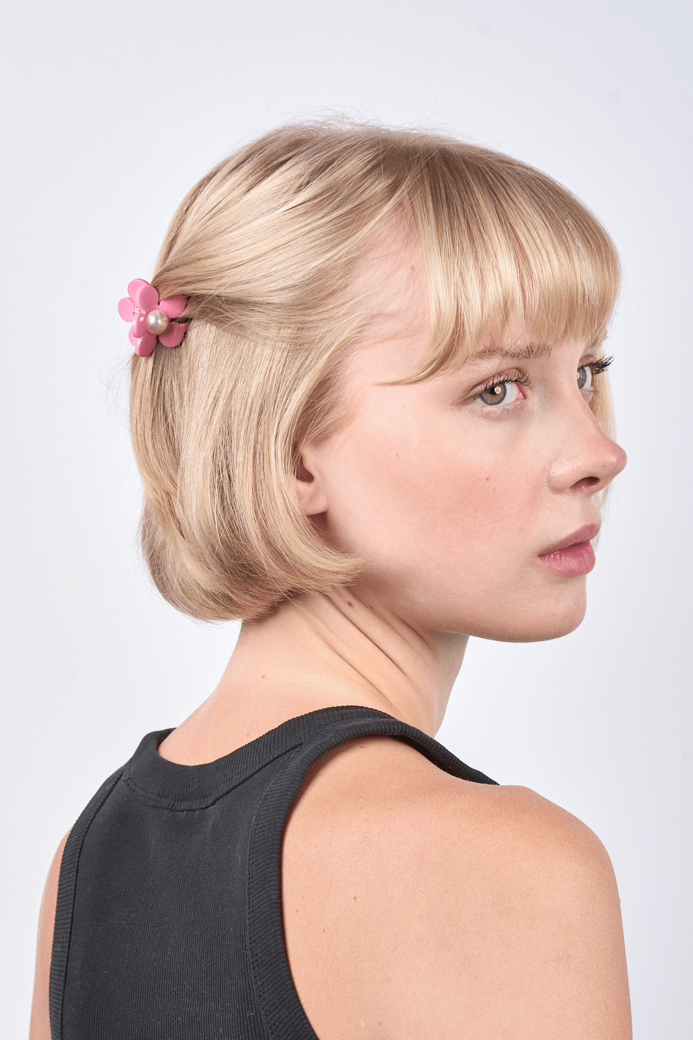 Eva Flower Pearly Mini is a charming hair claw featuring a beautiful floral design and an elegant pink shade, with a pearl on each side. Perfect for adding a feminine and decorative touch to your hairstyle. Its compact size makes it ideal for small sections or fine hair, while the floral details create a feminine expression 🌸💕