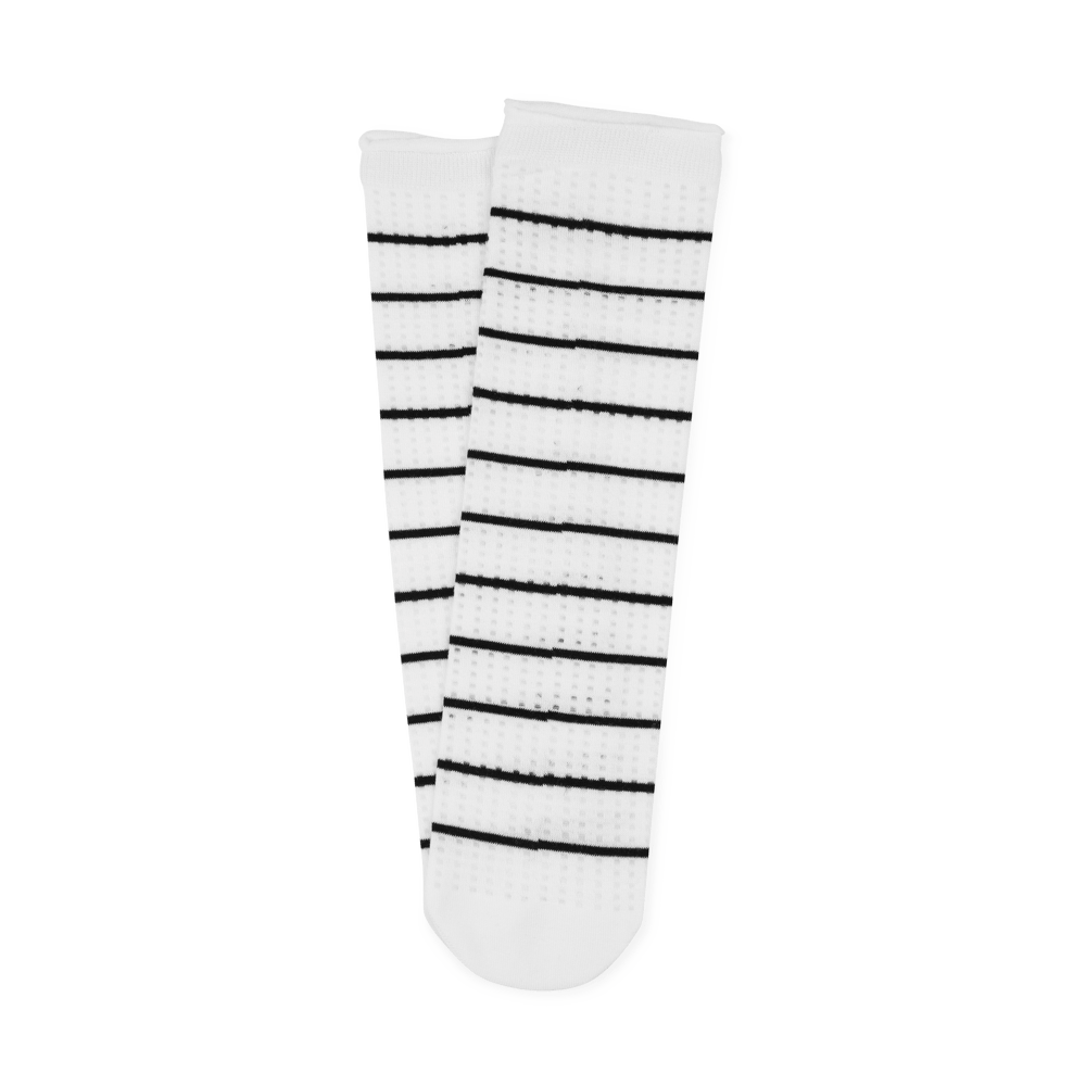 The white socks feature a lightly transparent texture and a striped design that adds edge and personality to your look, whether you style them with sneakers, sandals, or loafers. A must-have for those who love small details with big impact 🖤