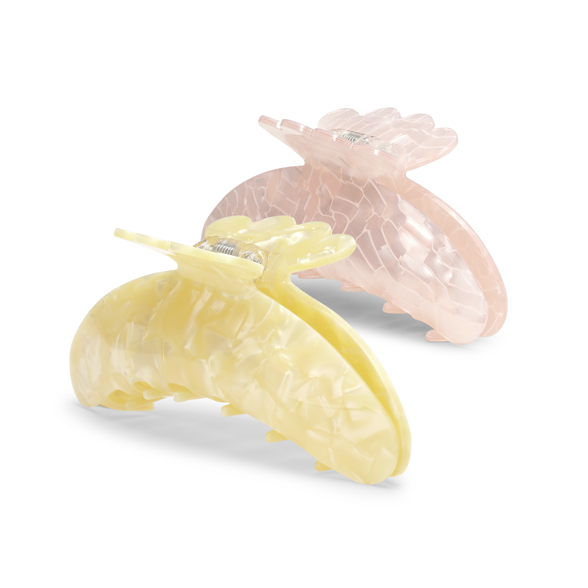 Helle Pastel Marble Yellow – en ekstra stor hårklemme i gul nuance, der holder håret sikkert på plads. en stor hårklemme i pastel gul med et dekorativt mønster. Perfekt til langt og kraftigt hår. Komposition: Acetate.
