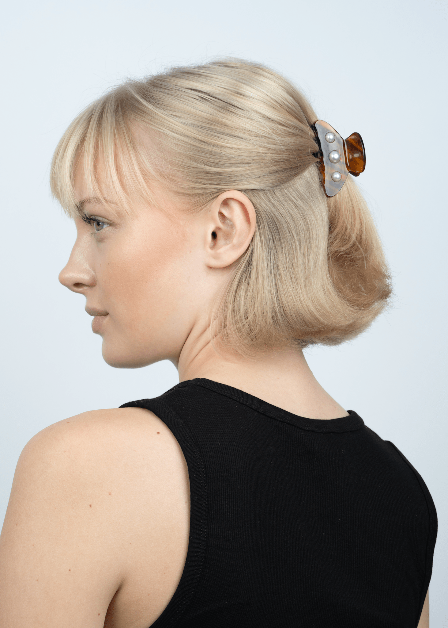 Use the Ida Classic Pearly Mini to keep small strands away from your face, as part of a half-up hairstyle, or as a decorative detail in an updo. The claw sits comfortably in the hair and offers a secure grip.