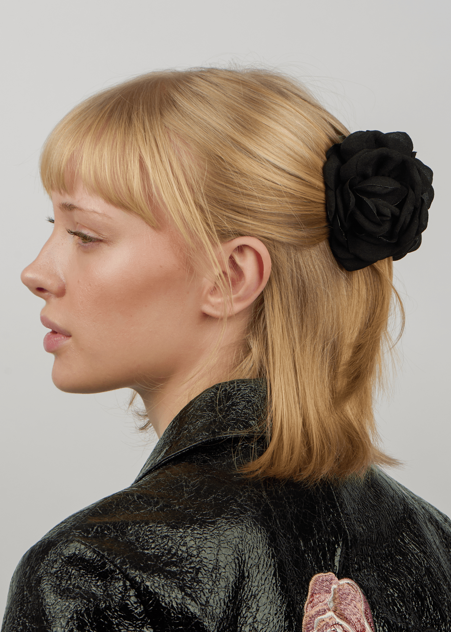 Rosa Hair Claw in black is an elegant hair claw shaped like a large flower. The classic black color makes it timeless and easy to style, while the spacious size ensures a secure grip that keeps your hair in place all day 🖤